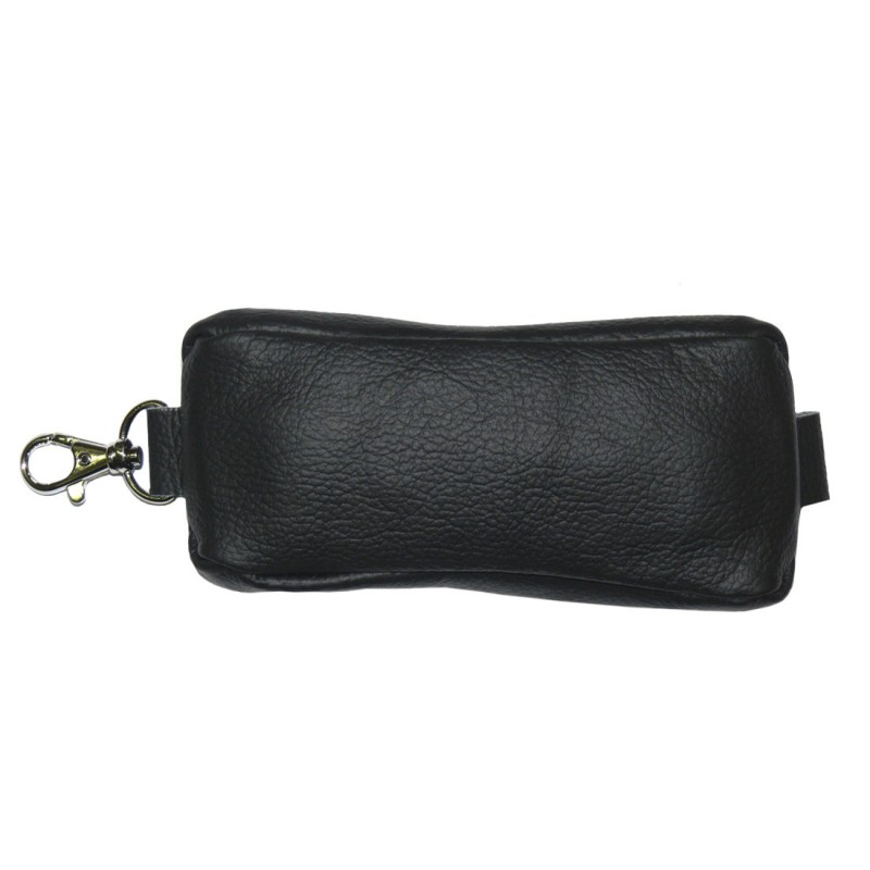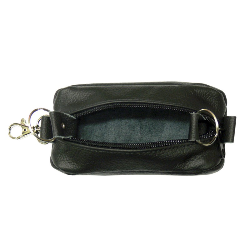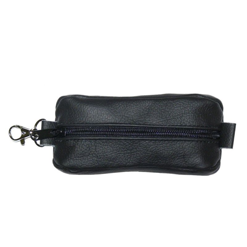 Ключница из натуральной кожи чёрного цвета, состоит из одного отделение закрывающегося на молнию шириной 6 мм имеет снаружи кожаную петлю с карабином для крепления ключницы к карману или сумке, а также две кожаных петлю петли с металлическими кольцами внутри отделения для крепления к ключнице ключей.